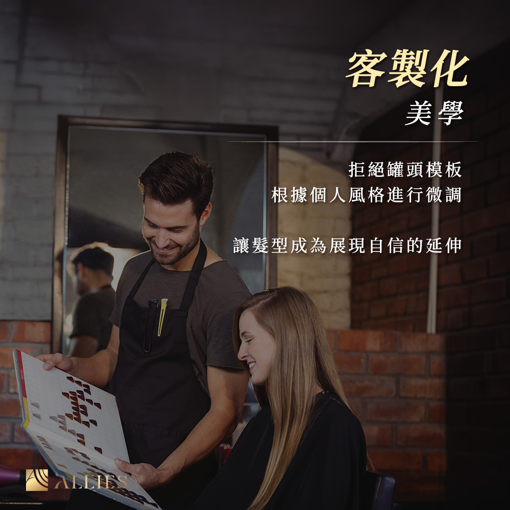 自 2017 年 3 月創立以來,高端沙龍品牌「ALLIES」始終致力於對「高級質感」與「客製化髮型」的極致追求。「ALLIES」一詞不僅是我們的名字,更貫穿了我們的品牌精神——代表著千變萬化、不斷調整與創新的無限可能。