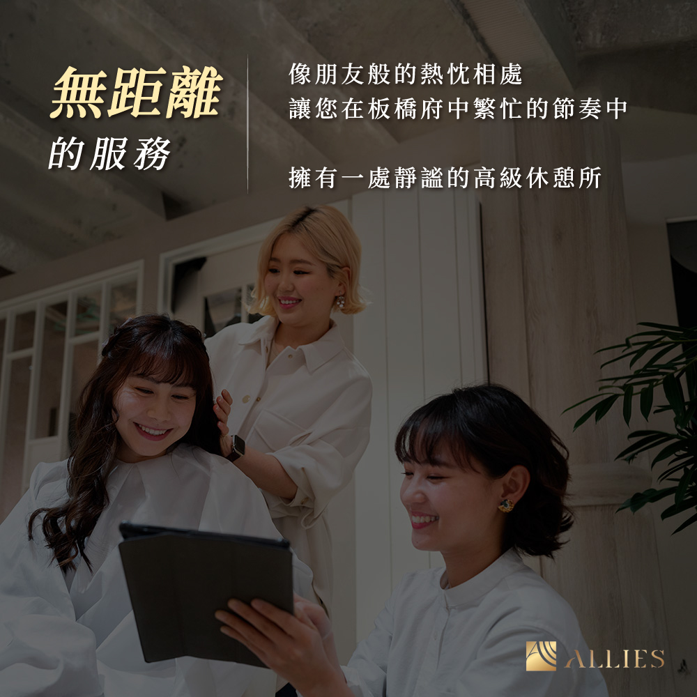 在 ALLIES 府中店,「專業」與「親切」是併行的。我們深知高端服務不應帶有距離感,因此我們秉持熱忱、有溫度的理念,讓設計師成為您的美學顧問,更是傾聽需求的好朋友。